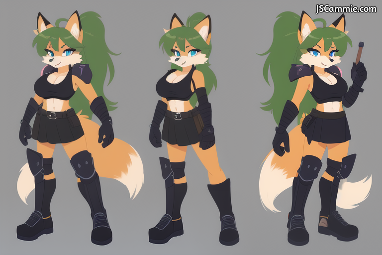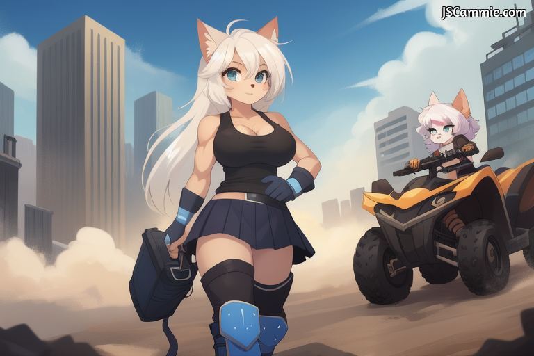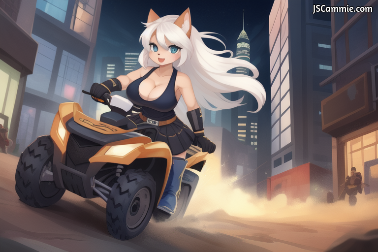 Prompt: Female Cat, Breed: Munchkin, solo, female focus, busty, cleavage, ribbed abs, long white Hair, white belly, white hands, white feet, techwear, Dark blue tank top, Dark Blue Skirt, Blue Boots, Shin Guards, ATV, city background, daytime.