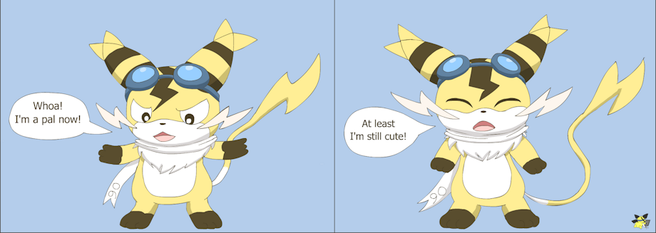 He becomes a Sparkit in the Palworld universe! I think it fits him~