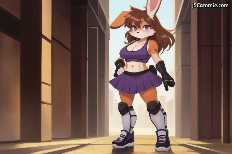Prompt: female rabbit, solo, female focus, busty, Cleavage, ribbed abs, Brown hair, orange fur, white belly, techwear, white stockings, purple tank Top, Purple skirt, shoes, shin Guards, Standing up.