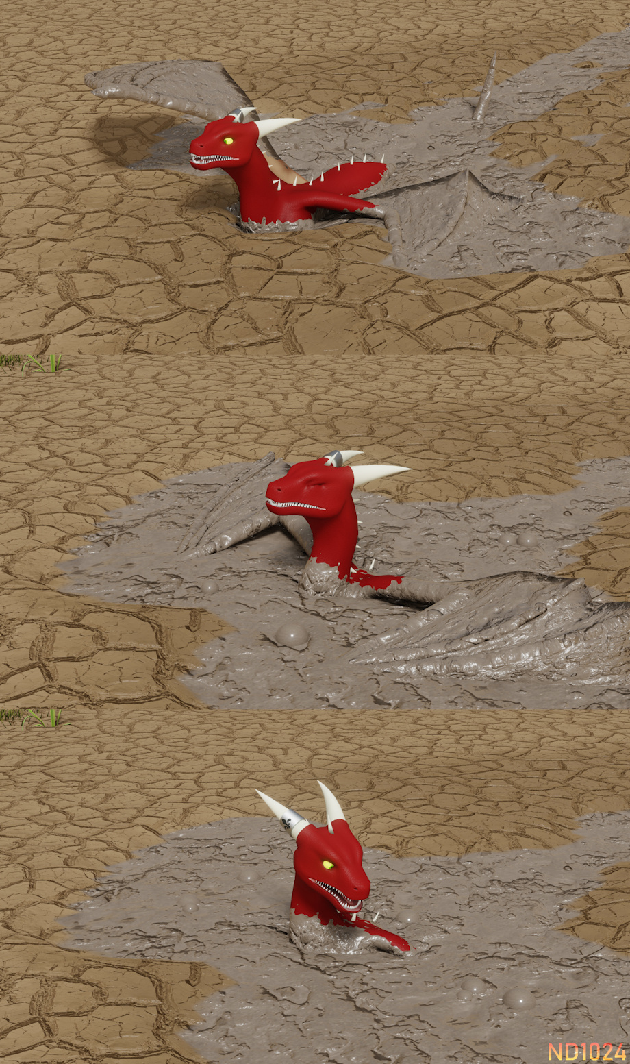 Kartonis was strolling along until he spotted a shiny golden default cube conspicuously lying in the middle of a dry lake. Stepping forward the dragon strolls on, ignoring the cracked ground giving way to clay-like mud beneath his talons. Kartonis continues onward, ignoring the shallow muck clinging to his claws until suddenly the wobbly cracked earth gives way to quicksand, instantly swallowing the lower half of the red dragon.