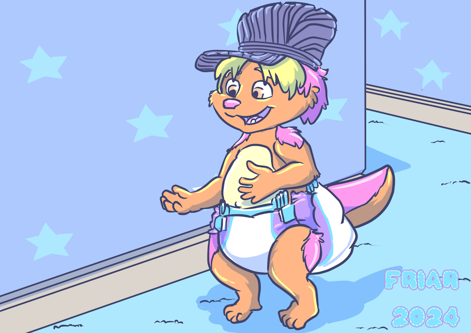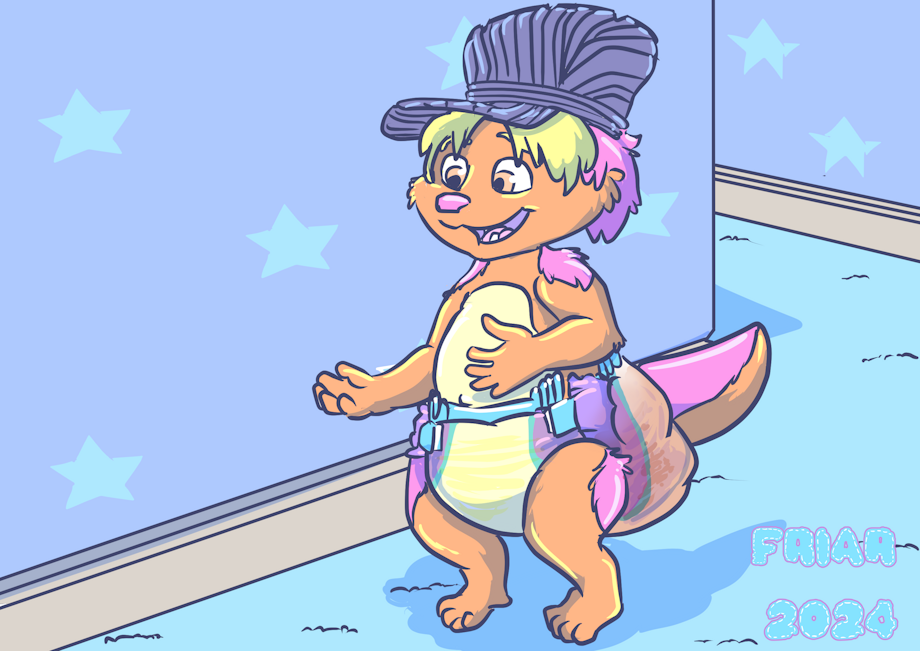 Illustration of Friar the wet and messy diapered wallaby dressed as Kip from Word Party, wearing a blue cap with his arms open by a star printed wall in a hallway. A caption reads "I have no idea. I wear diapers."