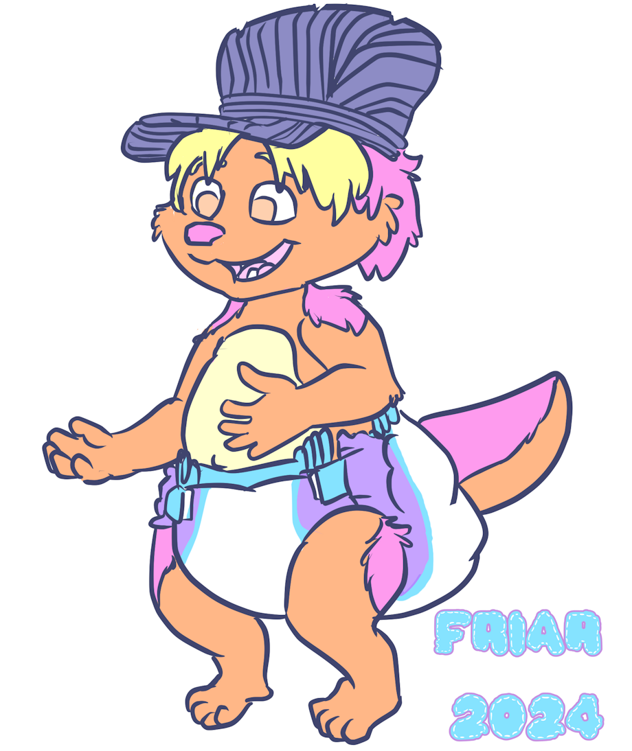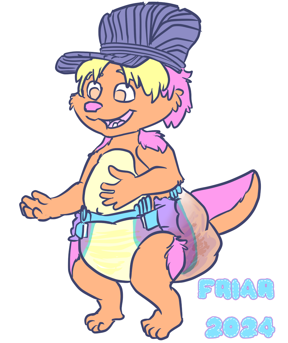 Illustration of Friar the wet and messy diapered wallaby dressed as Kip from Word Party, wearing a blue cap with his arms open by a star printed wall in a hallway. A caption reads "I have no idea. I wear diapers."