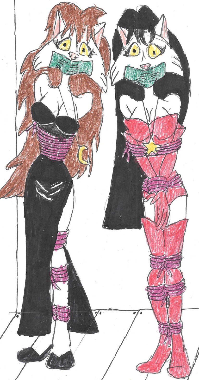 Here is Pam and Polly, the cat witches, from Eek! the Cat episode "Quadrapedia" being bound and gagged. I am sure that Eek the Cat will risk life and limb to save them.