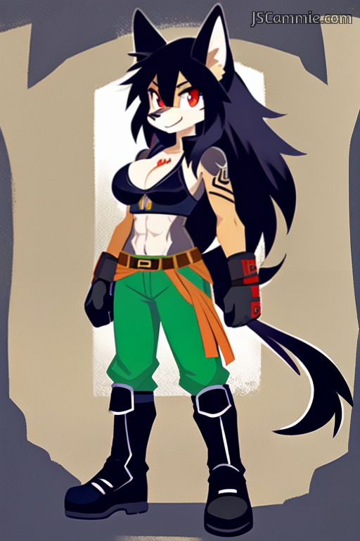 Prompt: hell hound, female, busty, cleavage, ribbed abs, red eyes, long hair, tribal tattoos on arms, techwear, black tank top, green pants, black boots, shin guards