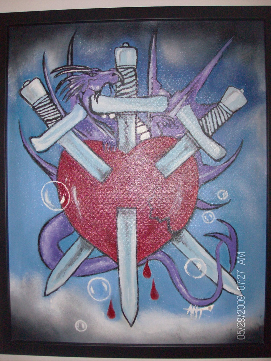 Thought I post one of my oil pantings here since on other sites people liked it. It's painted on Canvis board. Its the three of swords card from my dragon tarot deck this only took me two weeks to make and I did sign my name with a small amethyst heart in it but its hard to tell. Original artist of the deck Peter Pracownik Painting is mine tho!