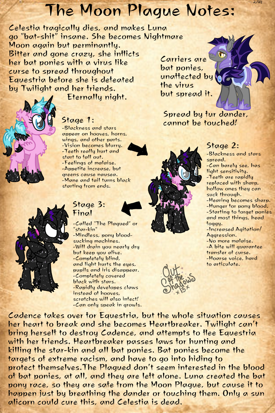 So most of what's going on with my own infection au is explained. I've been really into these things lately and I know I'm a little late to the party, but I love Nightmare Moon so much I decided to make a viral curse come from her. A party of terrorist assassin ponies murdered Celestia, and Luna found her body and clues that they were ordinary ponies. She turned into Nightmare Moon again and decided to unleash a terrible plague to end of all pony kind, only sparing her own bat ponies.