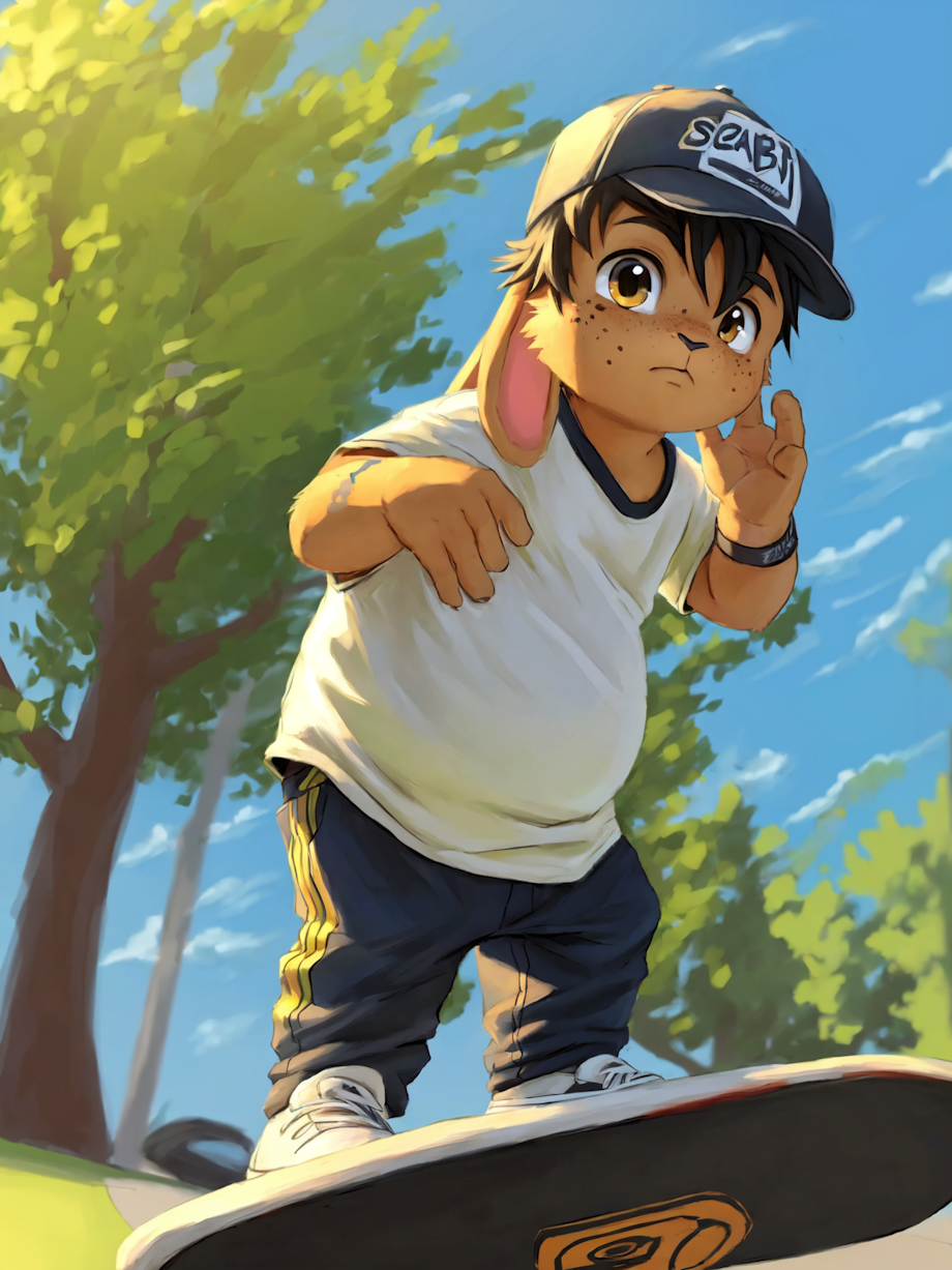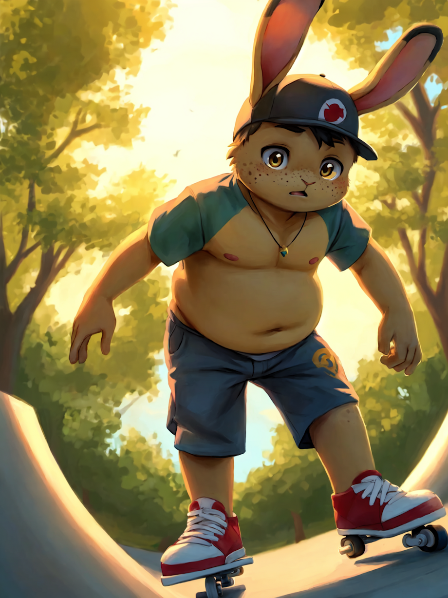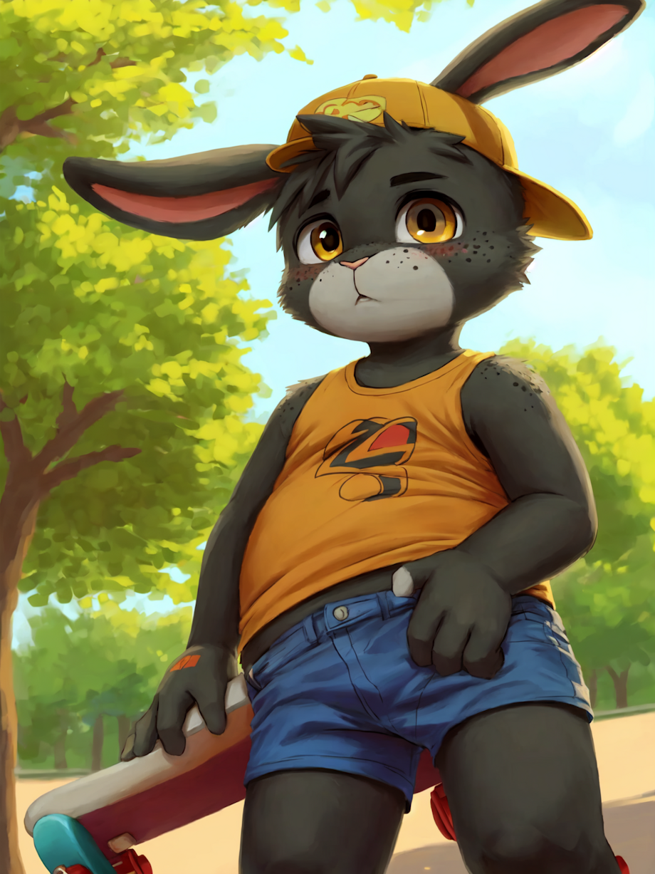 (((cub, young, shota, solo))), (rabbit boy, rabbit child, skater boy, black fur, gold eyes, overweight, pudgy, fat, freckles:1.2), portrait, erotic,