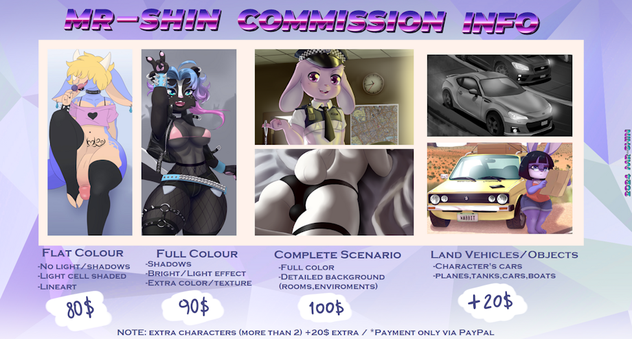 New prices but same rules and good attention to everyone who wants a piece made by me (PM if you want) new option too,offering vehicles at your pic 🚗✨The flat color background is free,as always,so i removed that option ,if you want more detailed info you can check my carrd here: https://mr-shin.carrd.co/#one (prices are old in the site ignore that until i update it)