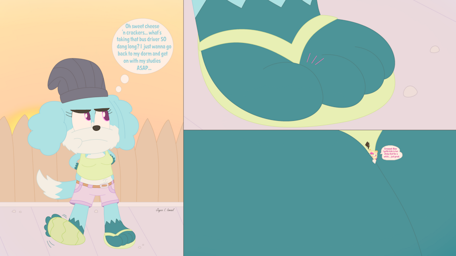 Waiting for the bus to take you back home during your college degree can be a bit of a chore, really. Bailey failed to notice that Tammy had been accidentally shrunk during an optional chemistry class or something and is now clinging onto her toes for quite a while... better make that a full day until Tammy returns to her normal size.