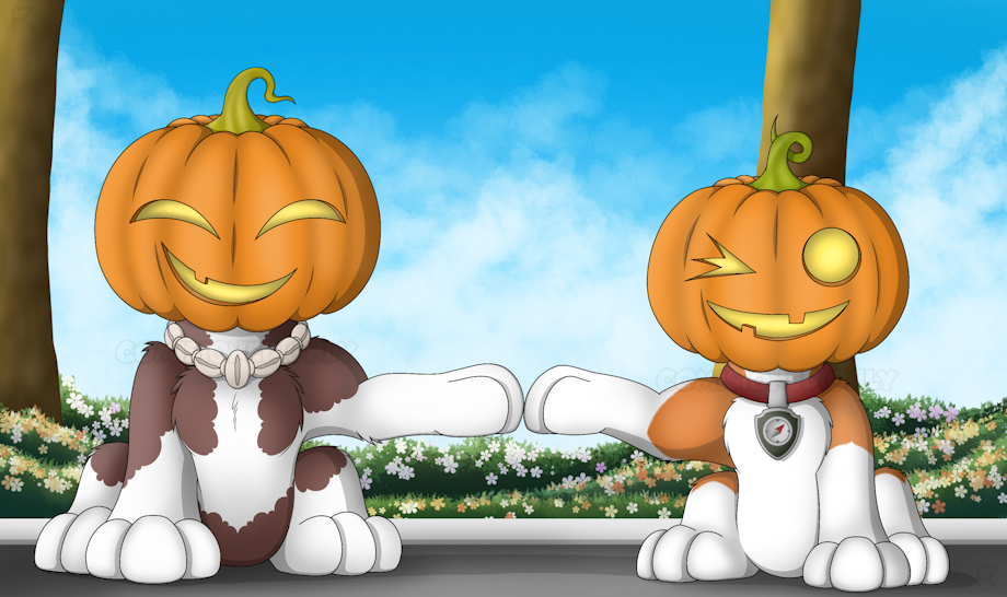 Meanwhile, Moby looks get a bit allergic of flowers, which is he'd never taste a spring season before. So, Tracker gives an unusual to him to covered it from an allergic, by give it a pumpkin carved and wear it on his head. Moby looks confused, as to what for to use it. So, Tracker explains if it's good for him to cover it from an allergic, and marked as a best friends, since he taugh him to be a good pup. Also, he wants to see him of being silly by wearing that, and Tracker will do the same as Moby did. Moby looks so happy, and then both of them put a carving pumpkin on their heads and doing a bump paws again. Hopefully, they're doing a good pup.