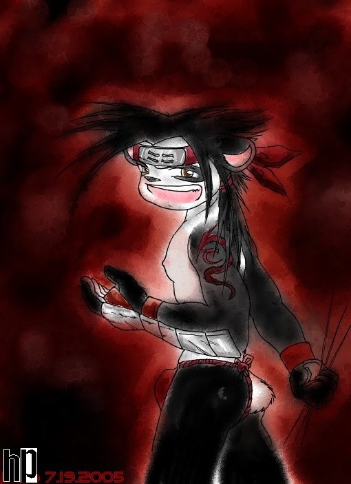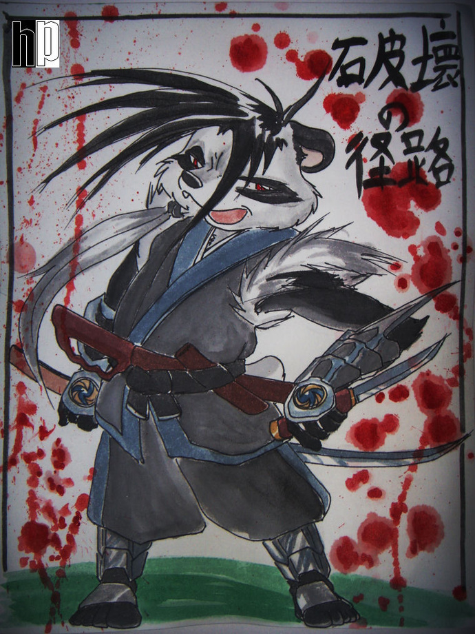 Would be neat to see him using the blood dripping blade as his caligraphy pen; allusion to sword play and kanji strokes and all that.