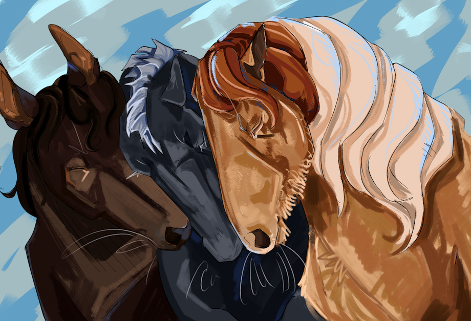 redm ggi equestrian honsies! from left to right we have brandy the mule, gambler the breton, and barney the ardennes! they're living my found family trope dreams.