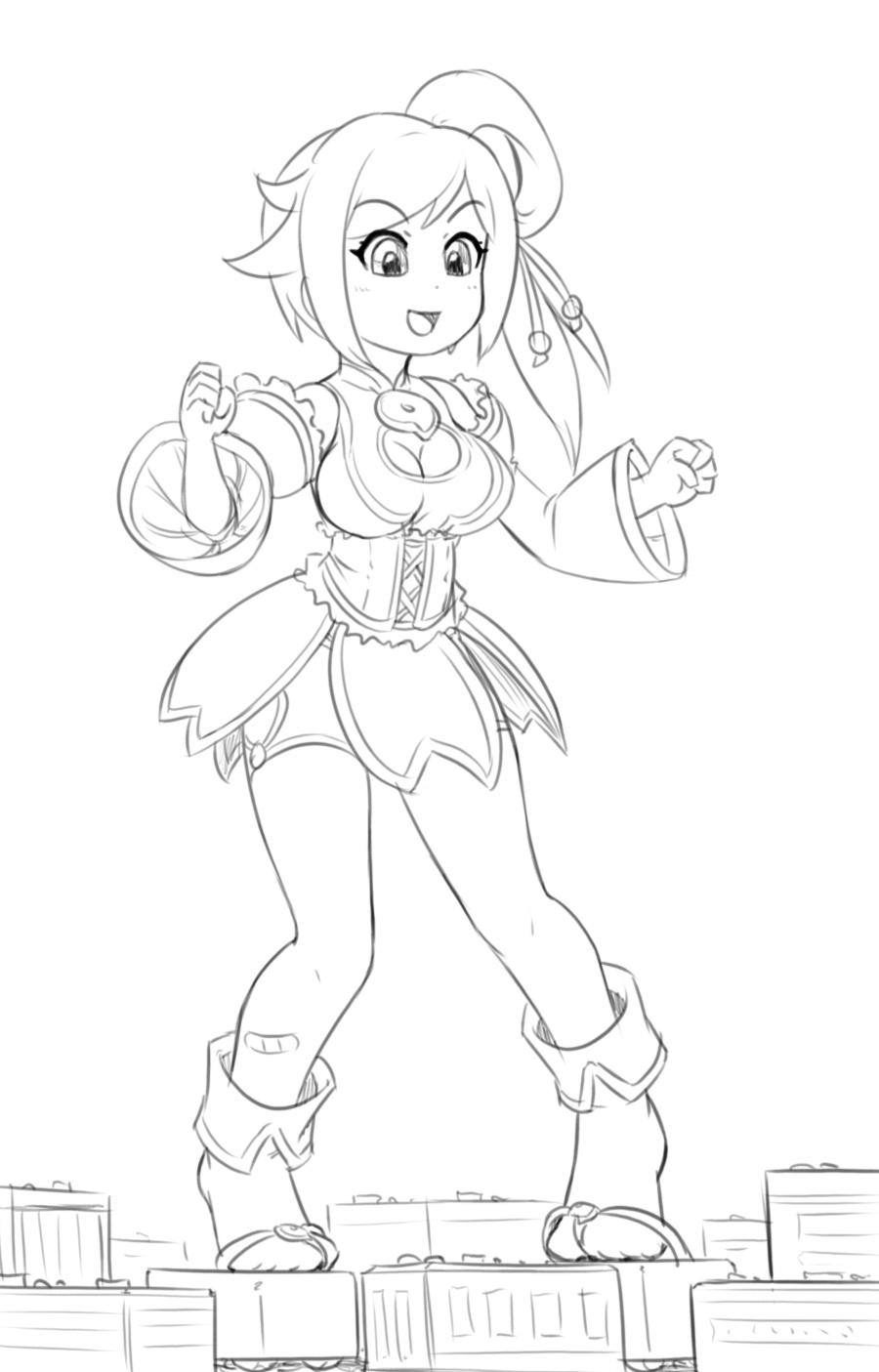 Awwwwwwww, her platform sandals are so huge that they rival the buildings! Standing tall above them so excited, Red's genuine happiness is downright infectious! Such a cute expression and pose! Her proportions are adorable too, so short, yet tall! I'm sure there's plenty of little wifeys to be found around here, time to snatch them all up! I like the pure lineart sketchiness look this one got, I'd say you using layers wasn't a mistake at all honestly!