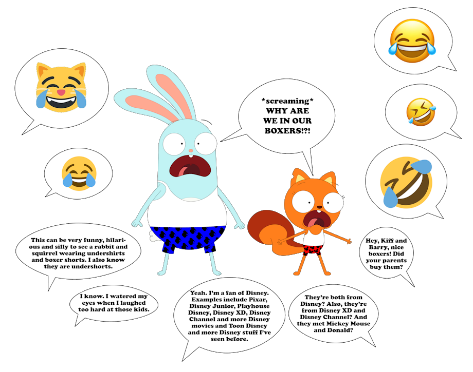 Here's something funny I drew on Adobe Illustrator. It's Kiff Chatterley and Barry Buns from Kiff in their underwear that consist of white sleeveless shirts that are tank top undershirts and A-shirts and boxers underwear that are undershorts and boxershorts. Everyone else is laughing and cracking up and giggling and guffawing at both of them. Because they really think it's way too funny, hilarious and silly, right? For