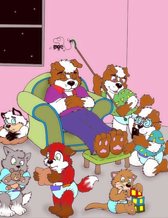 I'm hiding behind the chair, because I know we are going to get into trouble. Maybe Remi and Sammys poopy head daddy will not look behind his chair. Ha the others will be spanked while I'm hiding, and its all because of their dumb daddy cant find me. Yet agin if he does find me, he might use the hairbrush on me... NAH he just a doo doo head, he cant find me.