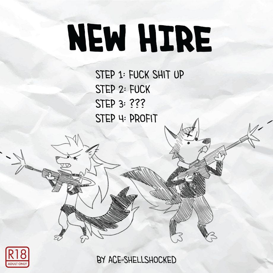 Title card of the comic "New Hire". Depicting Loona from Helluva Boss and a fan-made character who is a new hire for the mercenary group IMP. Enjoy!