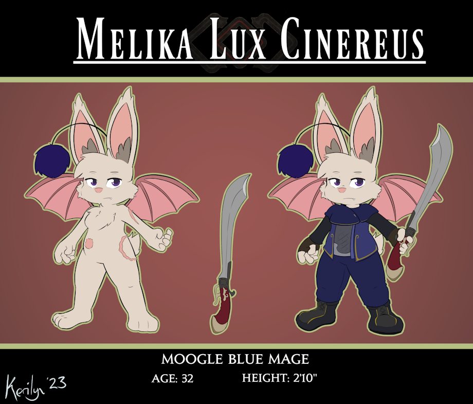 A reference sheet of a moogle I play in a Final Fantasy D20 tabletop campaign! Her name's Melika and she's a blue mage, hence the scarring - she's known to get up-close and personal with the monsters she fights.