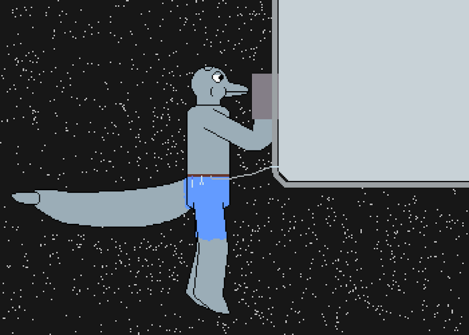 When maintenance on the outside of the space station has to get done, it HAS to get done, even if no suits are available. Luckily, one of the engineers just happens to be a dolphin with especially strong lungs, so he's called to get the work done. He's a little frustrated, since he'd been woken up for this, and he didn't bother to get dressed in anything more than shorts and his utility belt. With his safety line attached to a rail, he holds his breath and climbs along the outside of the station to the access panel that needs repairs.