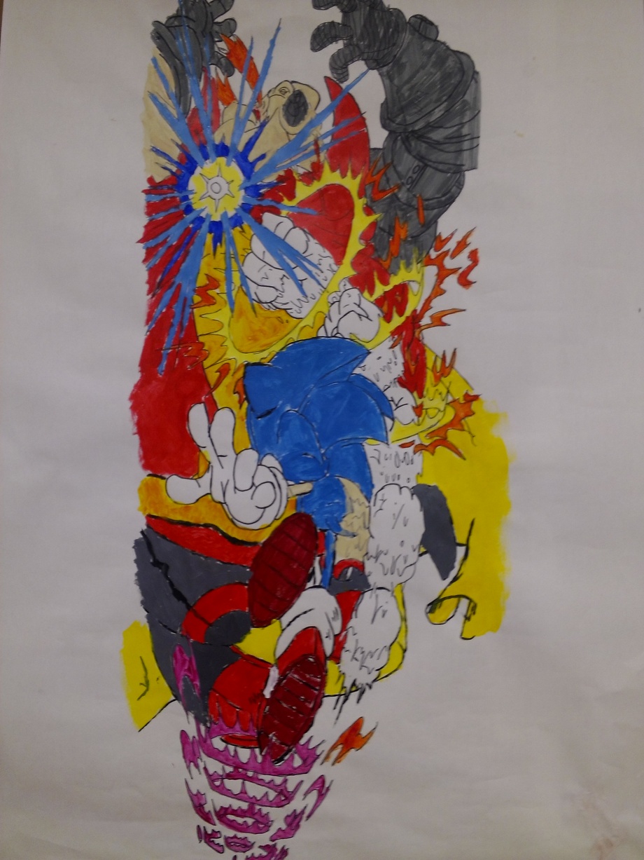 Yes. You are not seeing things. THIS is what I produced for my college art class. I had to do a pop-art project... and I decided not to go the boring and lazy Andy Warhol route, and instead took my inspiration from Roy Lichtenstein. I took a panel (which some of you might recognize from Sonic #50, the greatest issue of the comic so far), and traced it with my tablet and an art program. I went to the UPS store and blew it up to 24 by 36 or something... (It's BIG!) and then painted it BY HAND with acrylics... and it's pretty much one of the two best pieces we had in class... Usually my stuff's the crappiest! :3