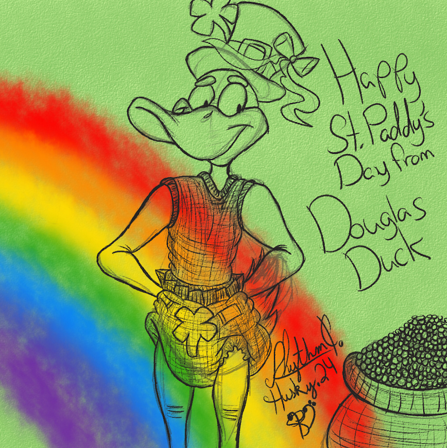 friend douglas duck all padded up and dressed up for st. paddy day and next to a pot of gold at the end of the rainbow.