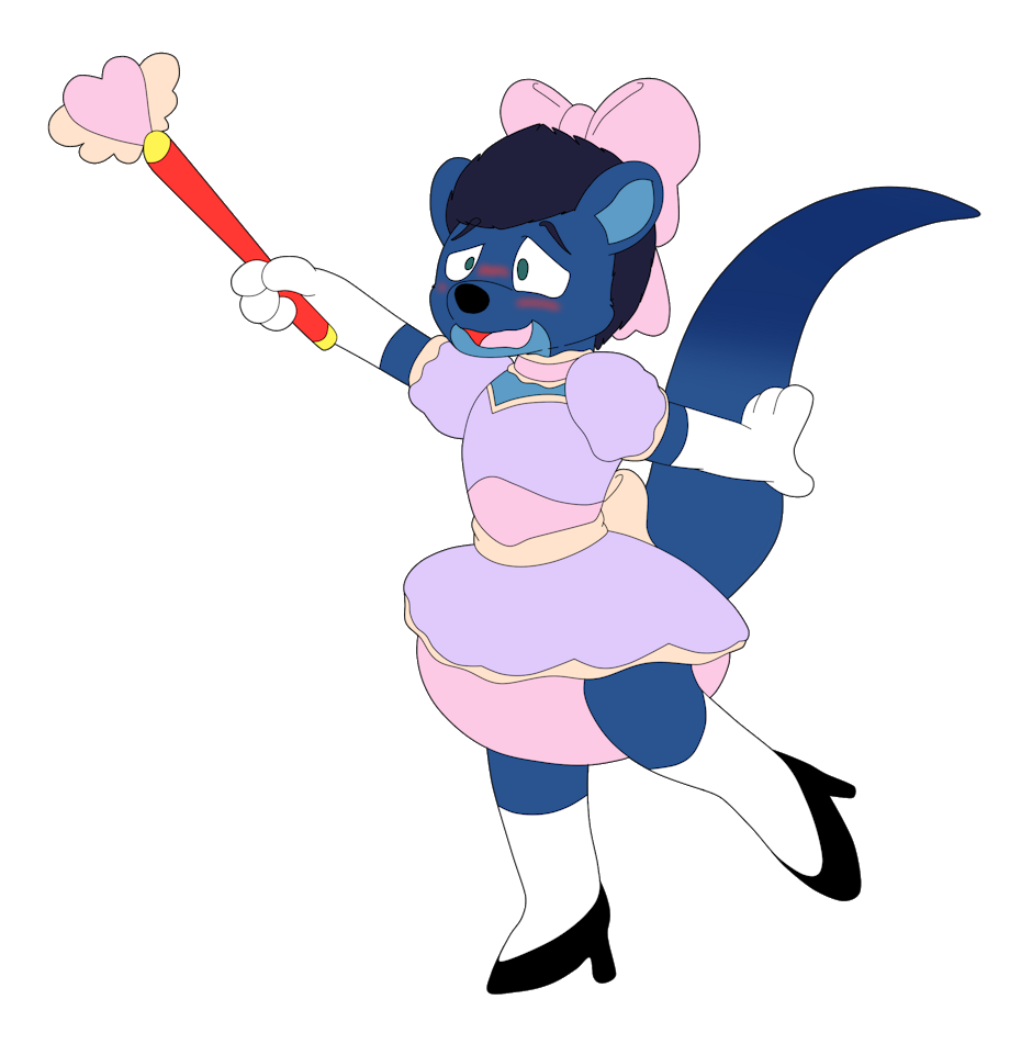 Once the glow subsided, joey was left standing there in the middle of the sidewalk with one leg up in the air as far as his leg could go and his right arm holding the wand out, pointing it into the air. As the realization of what he was wearing in public was setting in, he began to blush more brightly.