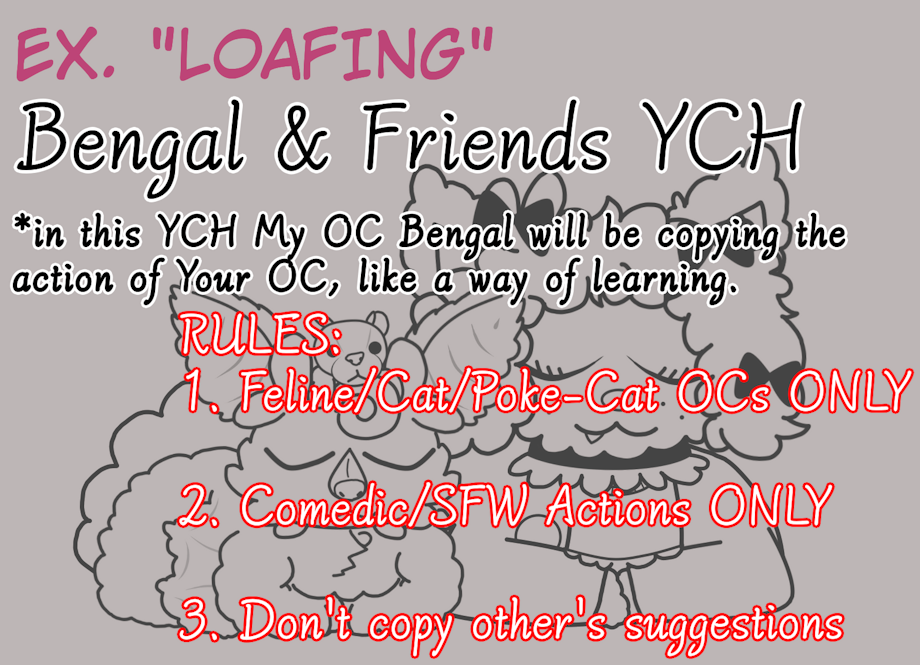 If you are interested please - Follow my rules - Post a SFW Ref of your Cat OC in the comments + the action you'd want them and Bengal to perform together - Sharing this post is completely optional!