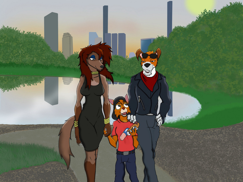 Instead of Oliver, Dodger and Rita being drawn as feral animals (like they are in the film) , they are now fully anthromorphic mammals and a lot more civilised. Rather than taking to theft on the streets Dodger and Rita would probably hold down respectable jobs. I wouldn't be surprised if they where together as a couple and decided to become adopted parents to Oliver. The family appear to be out in NYC central park for a stroll as the sun goes down.