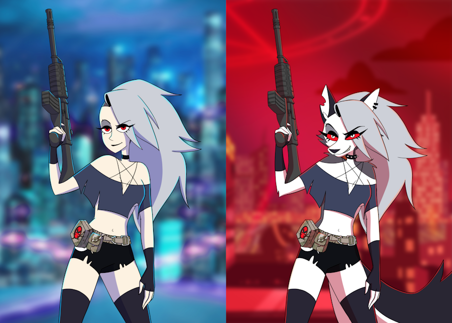 Just 2 wonderful human and anthro portraits of Loona with an M4 Carbine, battle belt, and striking a sexy pose. What's not to like?