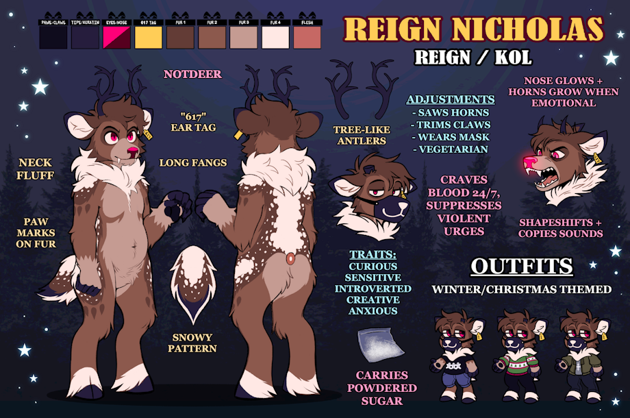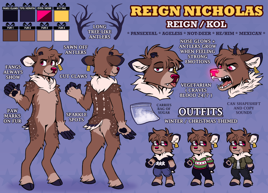 A deer who strives to improve and better himself, despite his difficulty understanding the world and people around him. He saws down his antlers to avoid unintentionally hurting someone and refrains from baring his fangs.