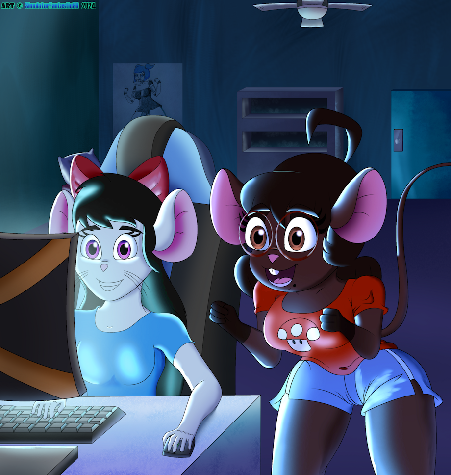 character Gwen from DeviantArt and my character Erika having a fun gaming experiences. Gwen came over Erika's house one afternoon to have a girl's-day together. Erika wasn't so much of a gamer. Especially with hard to do movements and tasks. But thanks to Gwen for giving her some pointers, she's IMMEDIATELY gotten the hang of it. This is gonna be a day for them to REMEMBER. 🐁🐭🎮🕹🖥