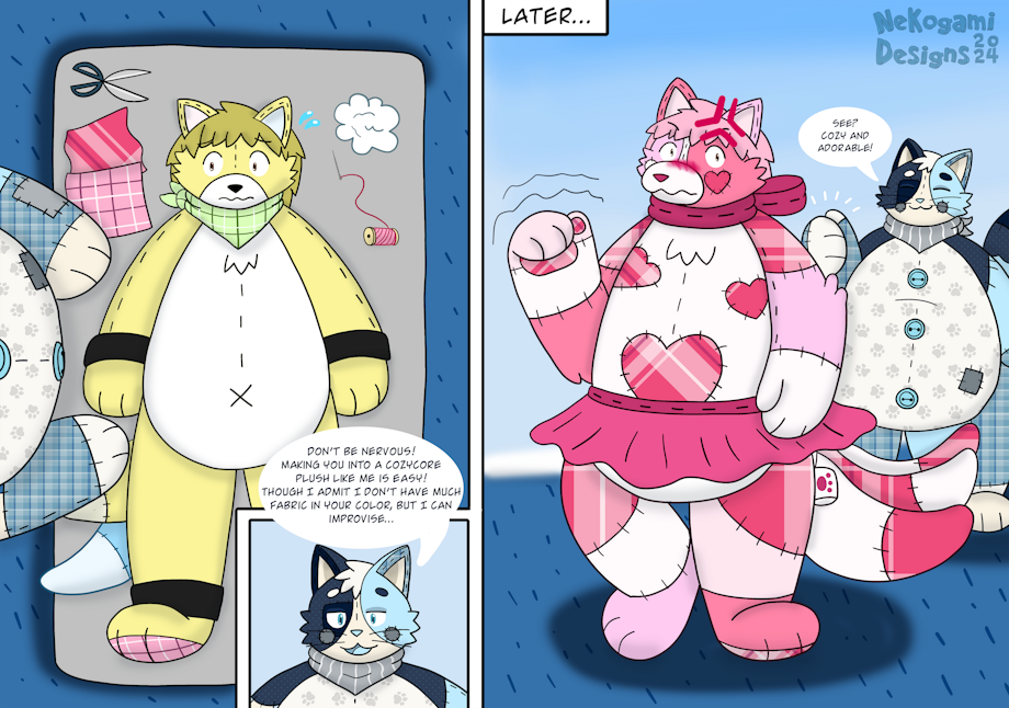 Welshie decided to go for the same "Cozycore" makeover that Inktail recently went through, and the cat was more then happy to help. Though next time he should bring his own material or else he will be stuck with whatever Ink has on hand... which he learned the hard way.