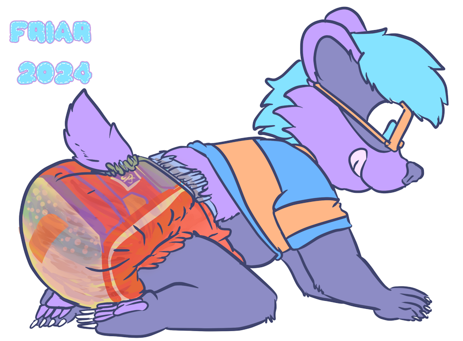 Illustration of Everett the wet and messy full-ups wearing badger crawling away from his training potty in his Cars training pants. Everett's snake plushie and rolled up blanket are on the bed, and other trailers are visible from the window.