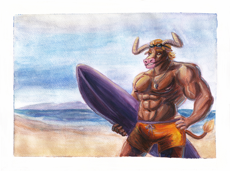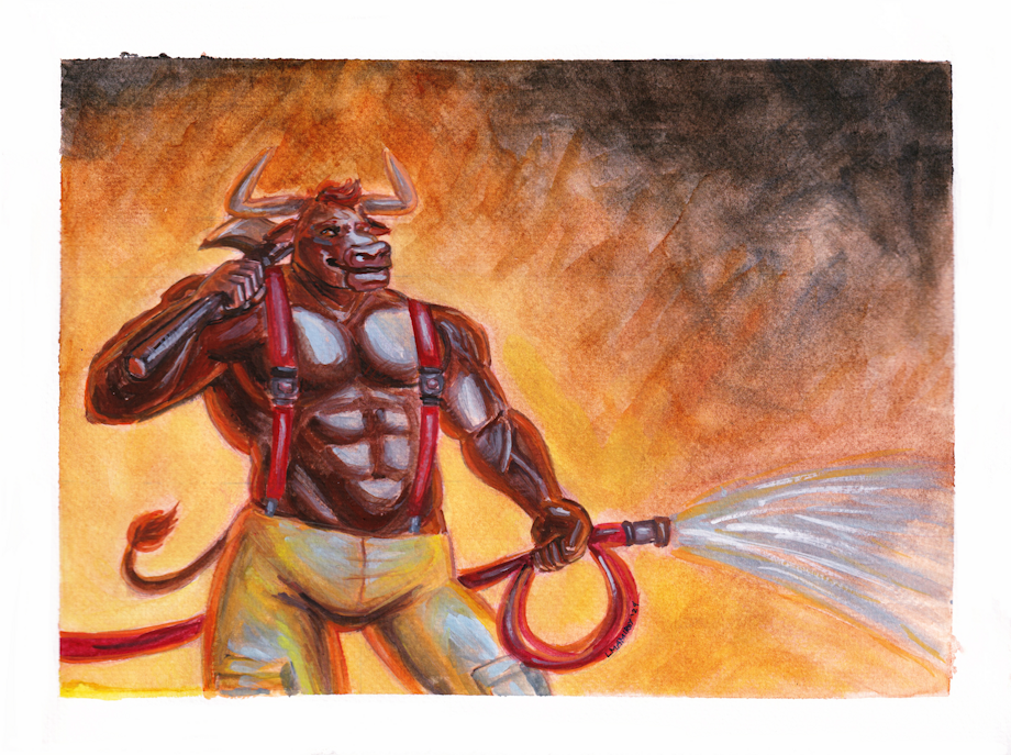 A series of paintings for Minotaur March, which are a revisit of paintings I did 5 years ago. My OC Taurus, who is a fireman, and my new OC, his lifeguard brother Boeuf.