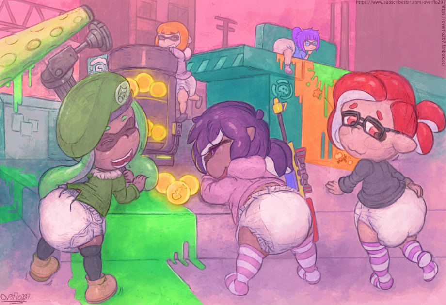 Reward for my 3 Precious Inklings together Idk why I did a background, it took all day to color ;>w< My three cutie inklings, Kyora, Domi and Red, (Siddy and Lizzie cameo in the background) All these squiddies doing a salmon run together, swallowing some tasty orange eggs, and partying with their woomies.