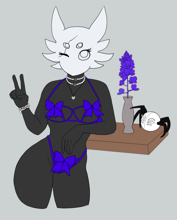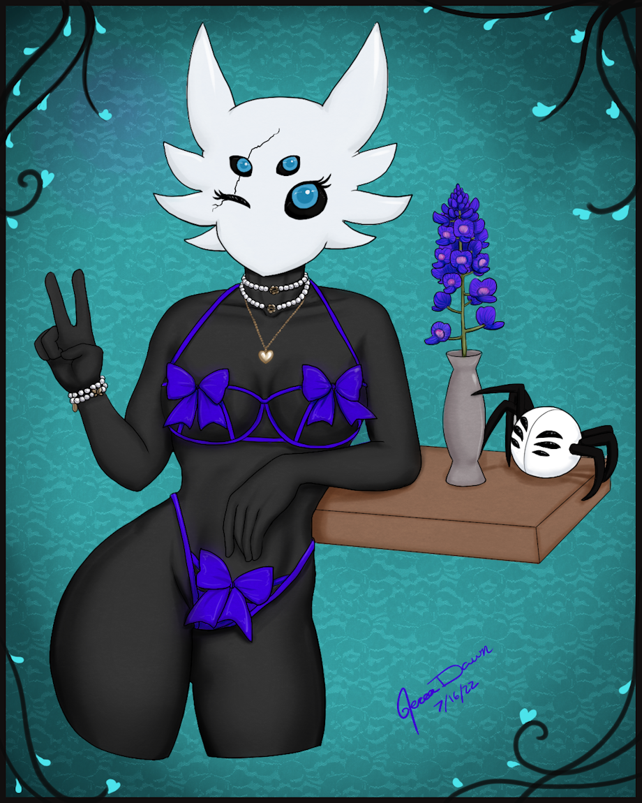 Here a really lovely pic done by the amazing artist Lovebunnies (https://www.furaffinity.net/user/lovebunnies - https://www.redbubble.com/people/Dawnbunny/shop) of my 2 lovely Hollow Knight characteres chilling out in this pic. Liliy the Hollow Knight Vessel girl posing showing off her cute sexy lingerie and lovely jewelry while her spider partner Tulip is just sitting on a shelf playing around with a vase filled with Bluebonnet flowers.