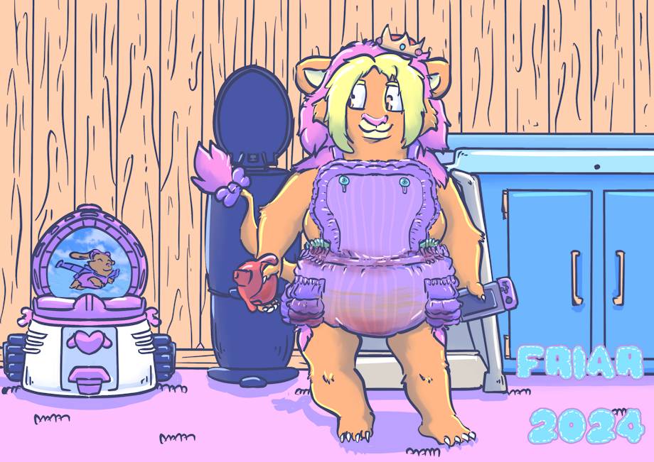 Illustration of Friar the diapered lion wearing a frilly romper, walking away from his changing table, open diaper pail, and Paw Patrol Skye potty with his sippie cup and Nintendo switch.