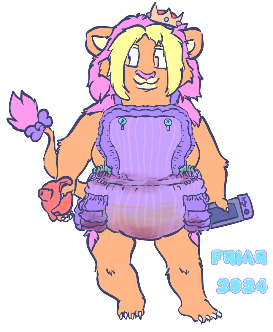 Illustration of Friar the diapered lion wearing a frilly romper, walking away from his changing table, open diaper pail, and Paw Patrol Skye potty with his sippie cup and Nintendo switch.