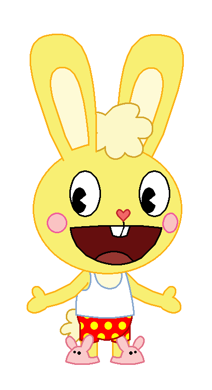 Here's another underwear picture from HTF/Happy Tree Friends with my favorite adult animated cartoon character who is anthropomorphic and speaks gibberish like the Angry Birds Toons and other characters from different TV shows, movies and more. Cuddles wearing his white sleeveless top that is a sleeveless shirt and undershirt and also is a tank top undershirt and A-shirt and red polka dot boxers in which the polka dots are yellow and are just the same as Floppy Rabbit's underwear and the same color as them. I even made Cuddles wear bunny slippers while wearing that two-piece underwear outfit. Looks cute and adorable, doesn't it? Also, it's for
