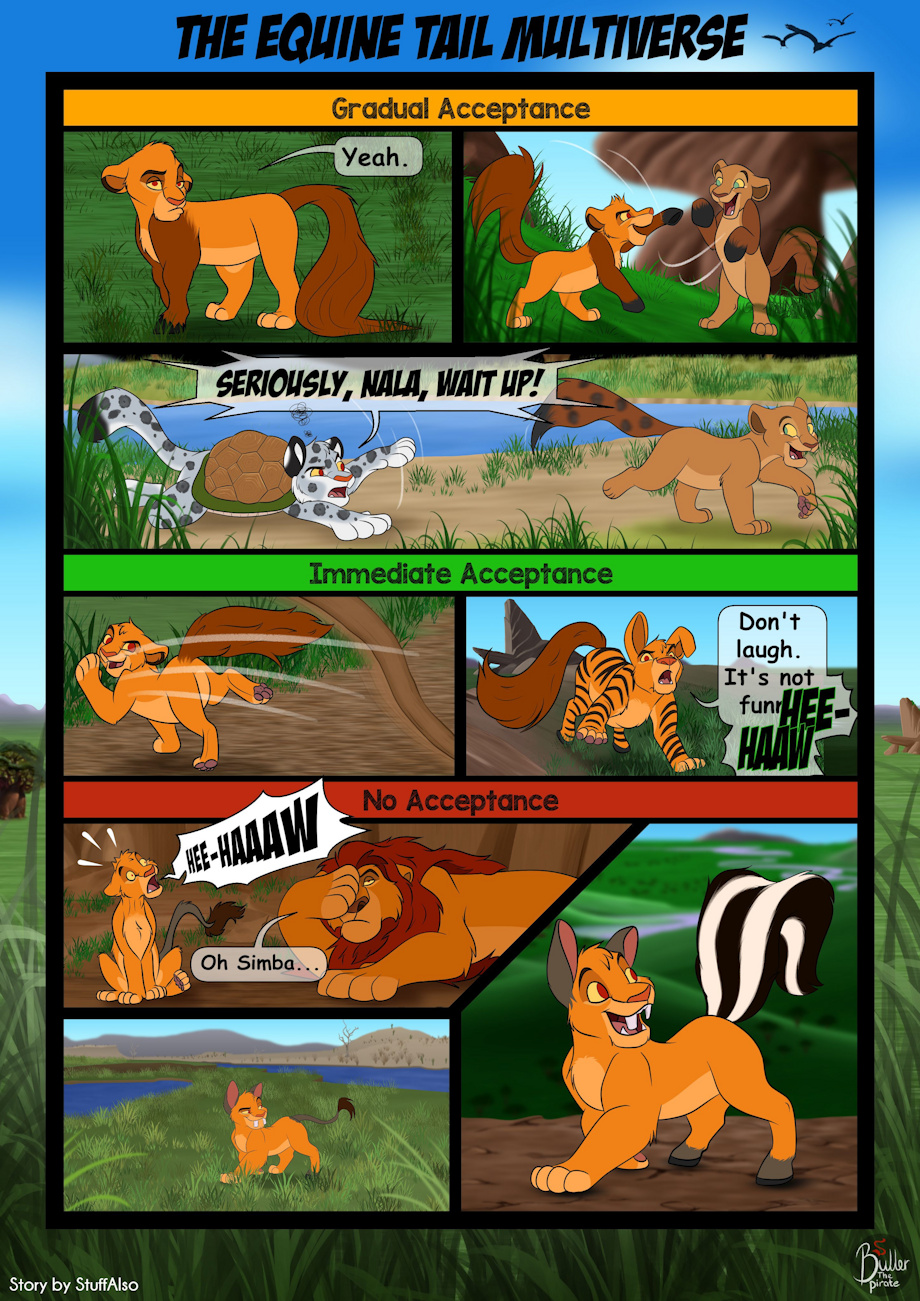 I consider there to be a handful of different timelines in my gallery. This comic shows off three of them, showing when Simba gradually, immediately and didn't accept an equine tail. All of which, the journey varies.