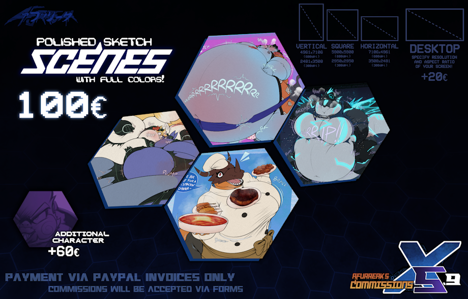 DO's Weight gain, Inflation, Transformation, Genderbend, Macro, some NSFW, Blueberry, Moderate (but not too many) Details etc... DON'T's Scat, Gore, Cub, (Violent) Popping, Superior/Superdetailed NSFW, Vore, and other extreme fetishes.
