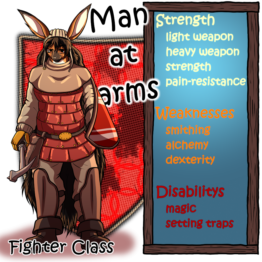 The weakness of this class is magic, trading and strength. These skills are much harder to obtain than usual.