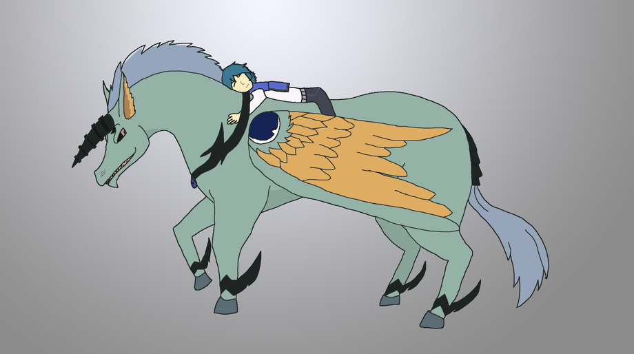 Alright, so this was originally going to be a drawing of a kelpie dragging someone off for dinner, but then I got randomly inspired to draw Advanced Sapphire Pegasus and Johan from Yu-Gi-Oh GX.
