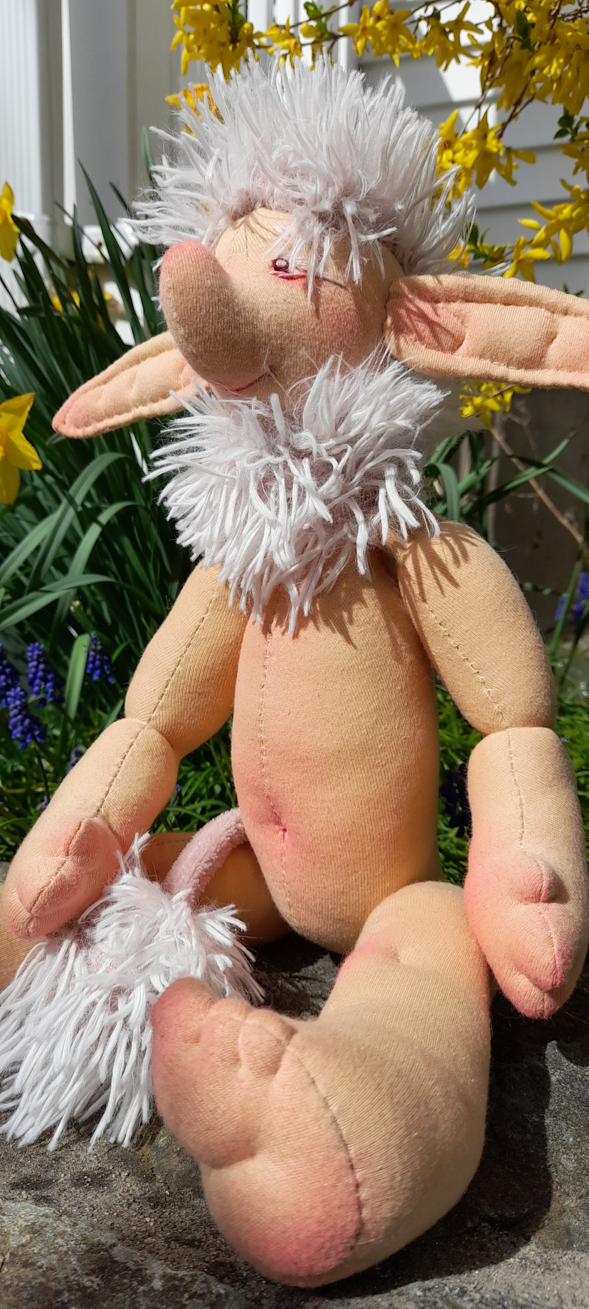 Hes 100% hand sewn + embroidered, from a one-off pattern, and his poofs and tail are made from a blanket I got from goodwill specifically for the purpose. The blushing was done with chalk pastels applied with a large paintbrush. Im rather proud of how the feet came out! It was a total experiment that worked great imo.
