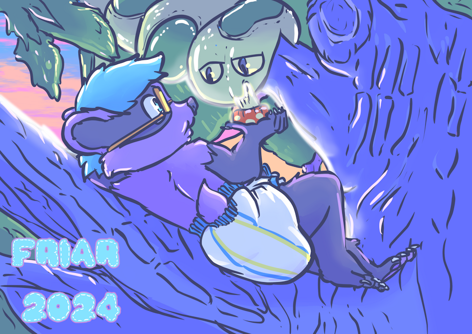 Illustration of Everett the wet and messy diapered badger reclining on a tree branch munching on a mushroom while his plush snake coils around another tree branch looking at Everett, with the twilight sky casting warm light on Everett and his snake plushie.
