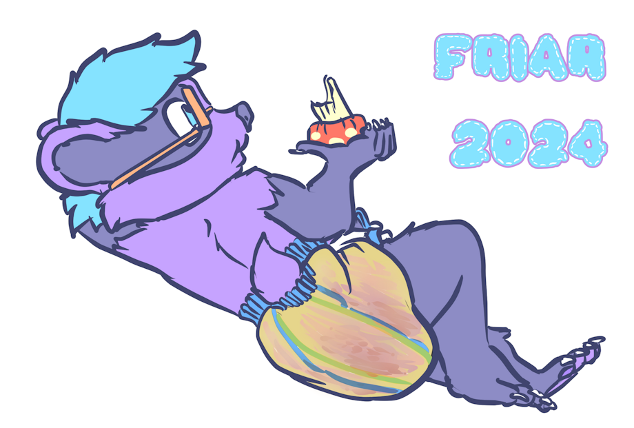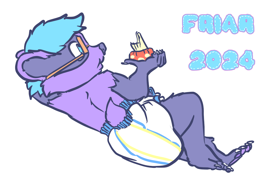 Illustration of Everett the wet and messy diapered badger reclining on a tree branch munching on a mushroom while his plush snake coils around another tree branch looking at Everett, with the twilight sky casting warm light on Everett and his snake plushie.