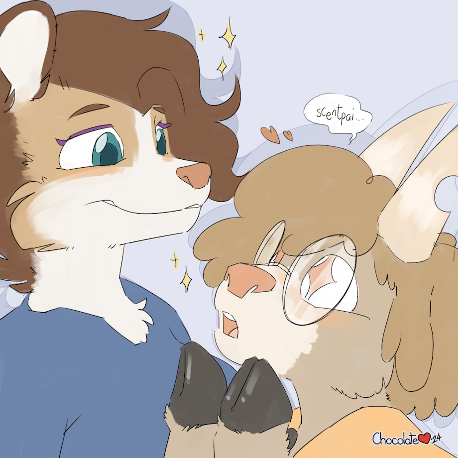 This all started with Robin consistently greeting Mishka in such a wistful way ever since she joined, and since I wanted to draw something for both of them anyway, this was perfect for me to tick several boxes all at one go (props to my friend Ihddn for coining "scentpai," it was perfect).
