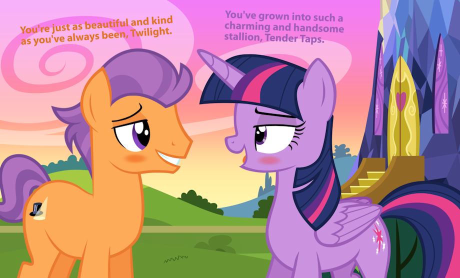 Tender Taps' been waiting too. Now he has more than one opportunity to sweep the gorgeous Princess of Friendship off her hooves and start a romance with her that he's been dreaming about ever since he was a kid.
