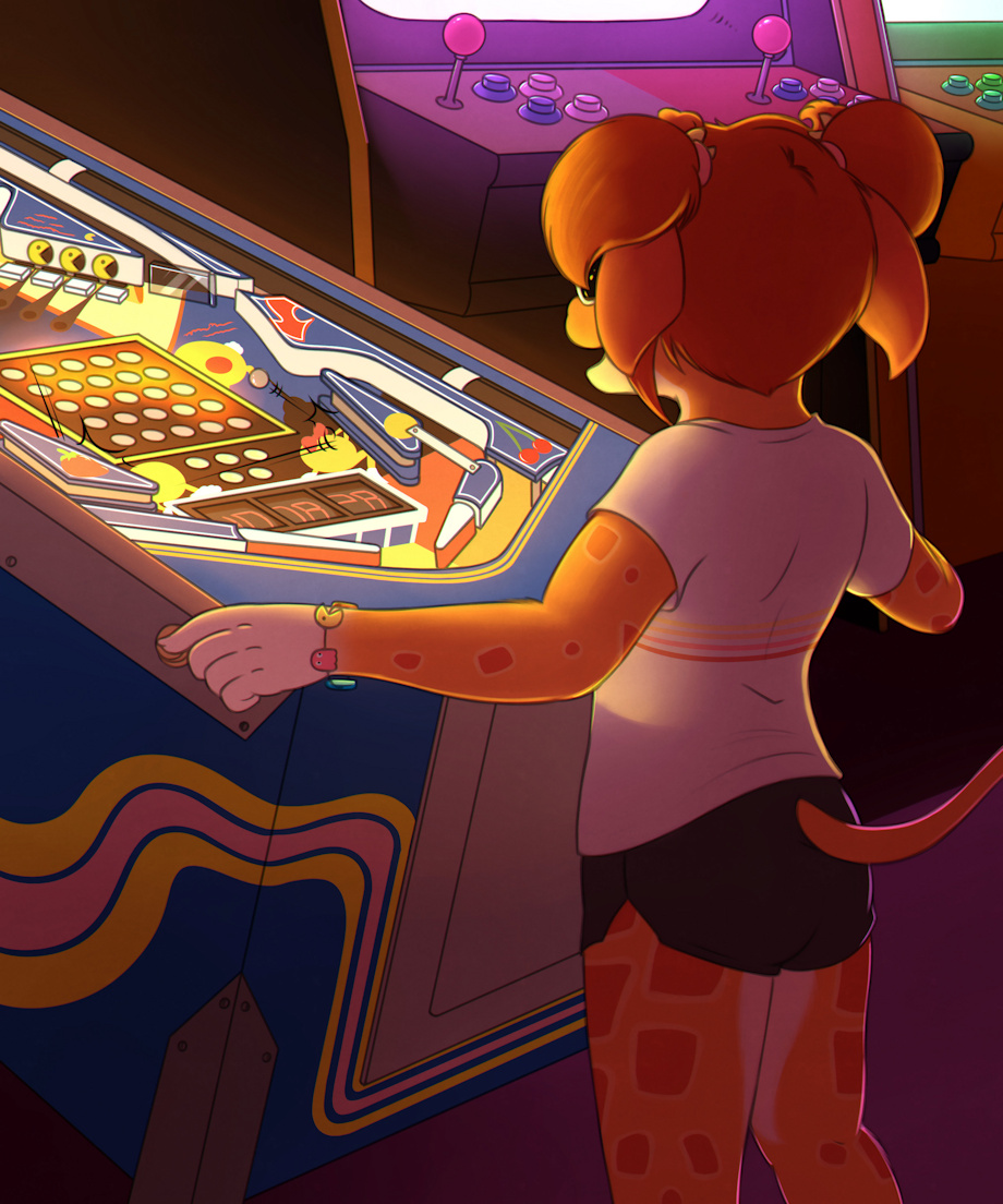 My Pac-Man-obsessed giraffe girl, Katherine "Pinky" Holifield, discovers the classic "Mr. & Mrs. Pac-Man" pinball machine (yes, there was indeed such a thing!), and she's gonna spend all day feeding quarters into it until she gets the high score!