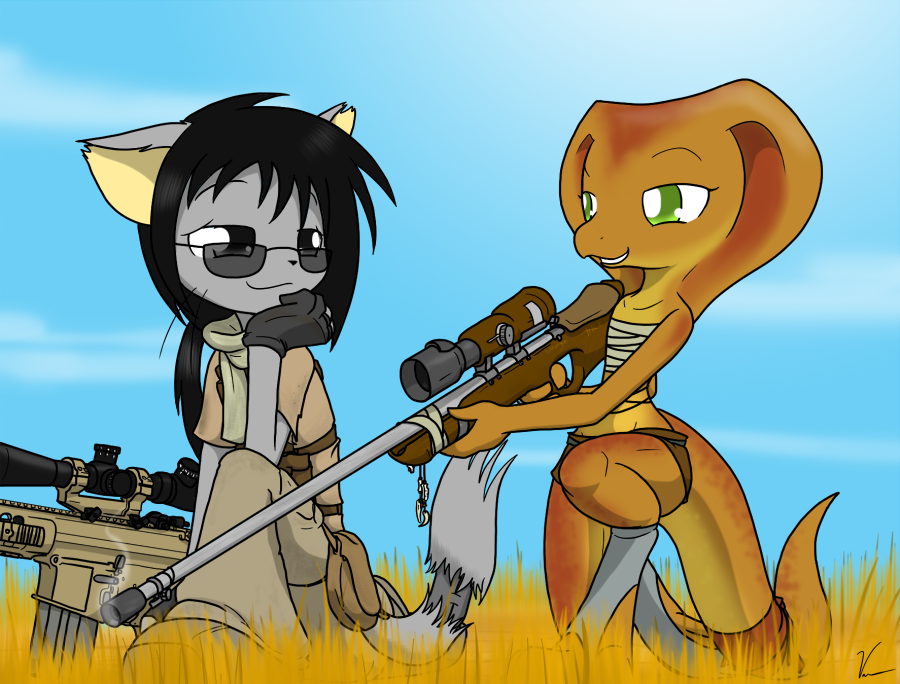 continuing my liking for aahnaye i made this... now the little bastard seems to have a liking for her as well. taking some potshots at some random targets, he cant help but fall for a girl who can shoot a rifle. plus come on how can you not like her yeah? damn you kitty!