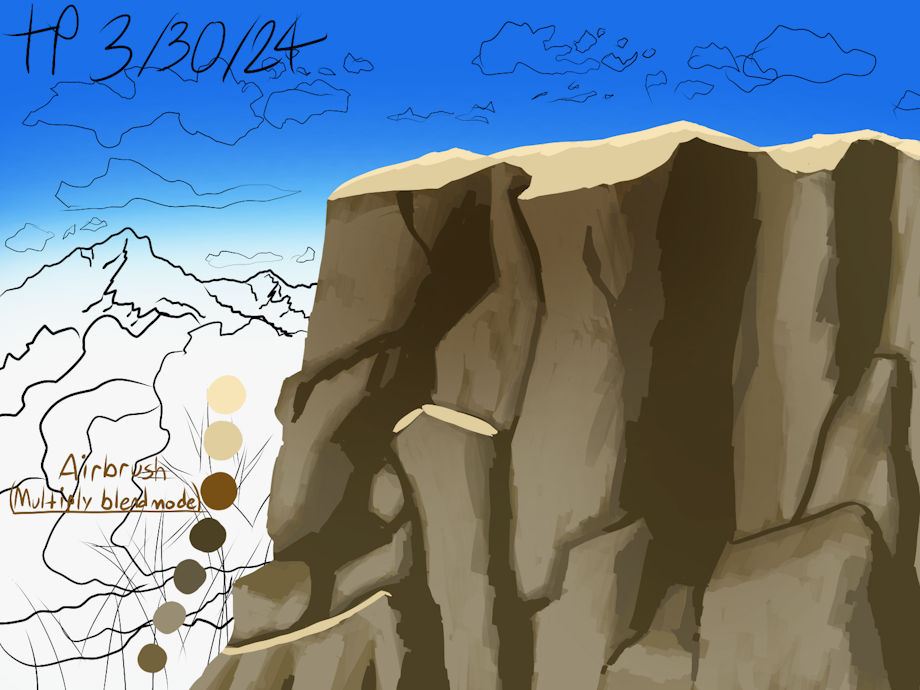 Most of the colors I used for the clouds, mountains, and trees were re-used from some of the previous BG practice illustrations I made. They were determined by saturation and mood using the hue shifting method(which is usually for pixel art).